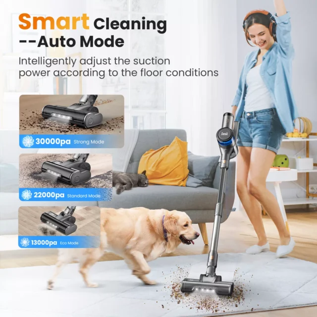 • Smart Adjustment & 4 Suction Modes: Easily switch between four suction modes for tailored cleaning power, whether you need intense suction for carpets or gentler suction for hardwood floors.