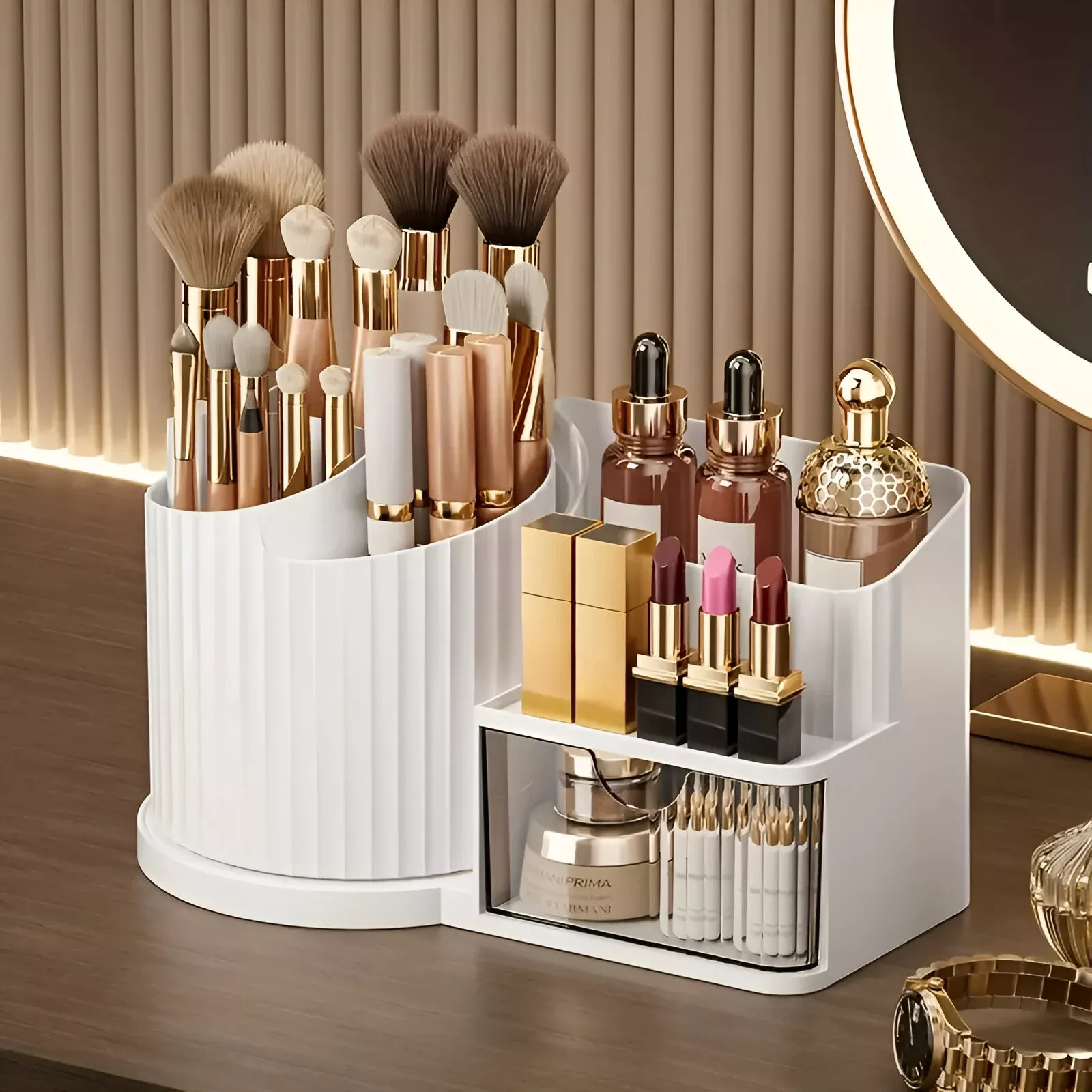 • All-in-one storage – holds skincare bottles, makeup brushes, lipsticks, and more.
