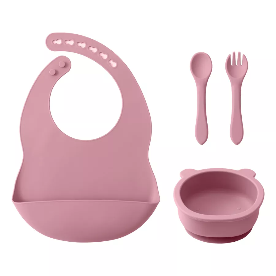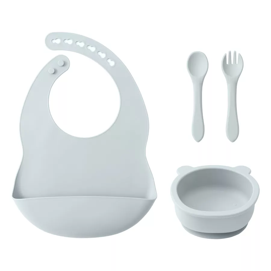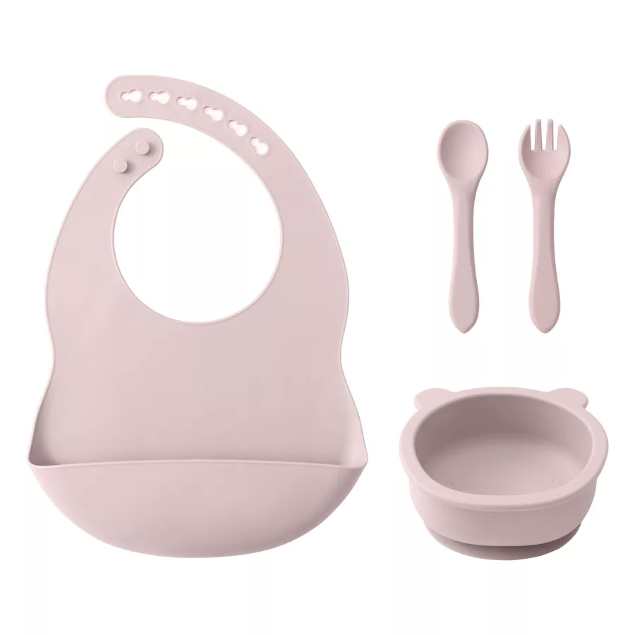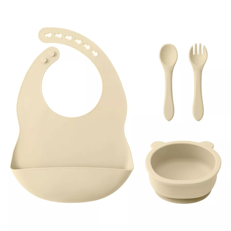 • 4-in-1 complete feeding set — bowl, plate, spoon, fork, and bib