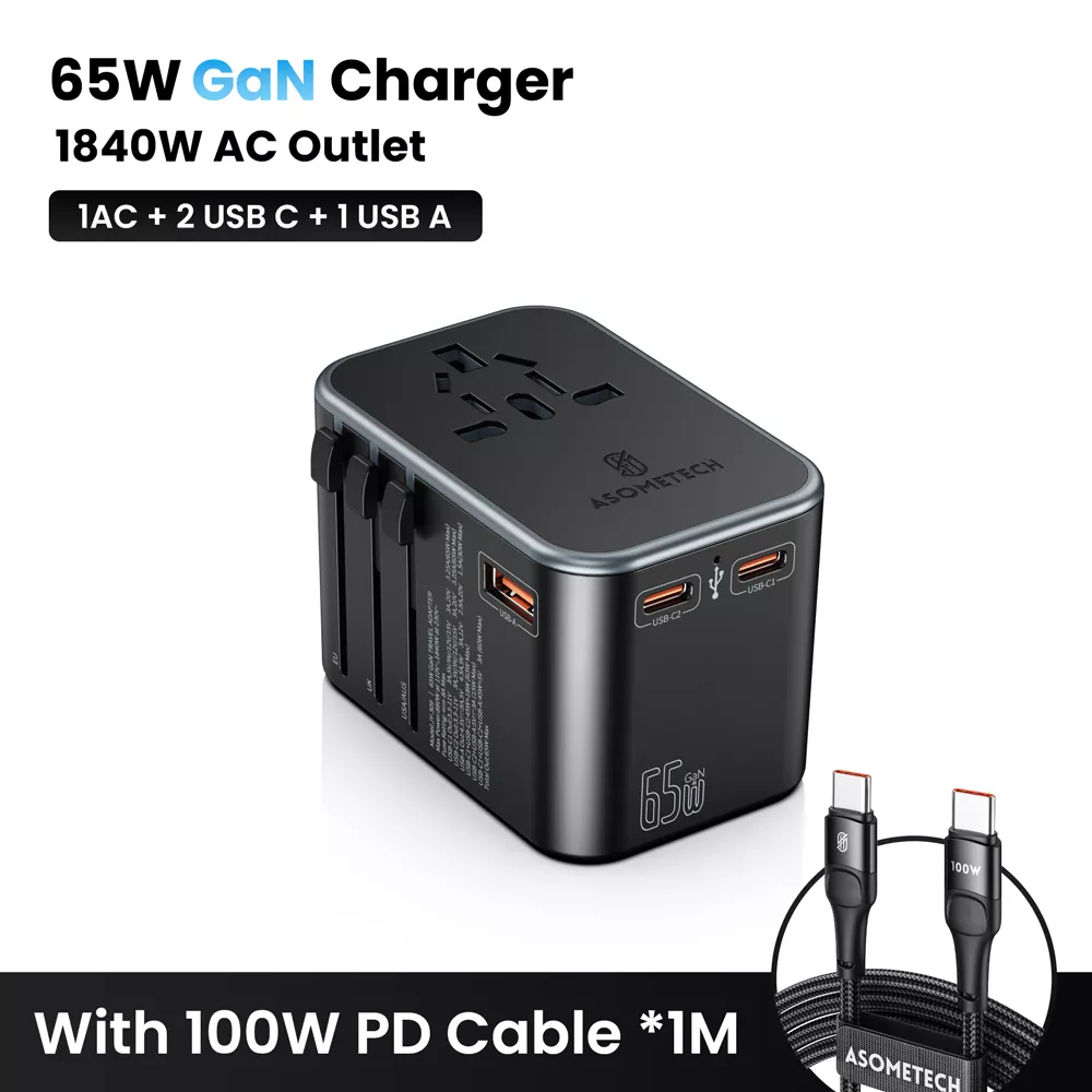 65W GaN International Travel Adapter with Fast Charging & Universal Plug