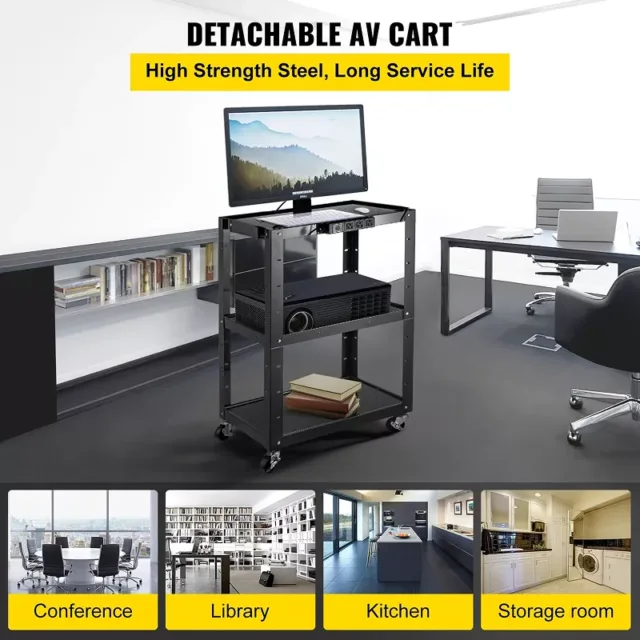 Designed for efficiency, the VEVOR adjustable AV cart is built to withstand the rigors of everyday use, providing reliable support for all your media equipment. With easy maneuverability, ample storage, and the ability to adjust the height, this cart is perfect for any environment that requires flexibility and heavy-duty performance.