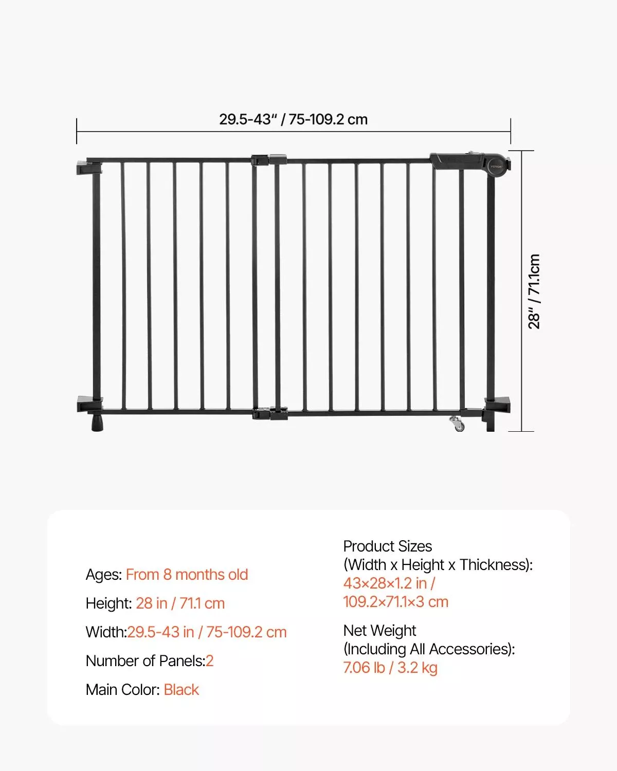 Crafted from high-quality stainless steel, this baby gate is built to last. With adjustable width ranging from 29.5 to 43 inches and standing 28 inches tall, it fits a wide range of spaces in your home. The 2.2-inch bar spacing prevents babies from getting stuck and pets from slipping through. Plus, the double-lock system ensures that only adults can open the gate — adding an extra layer of safety.
