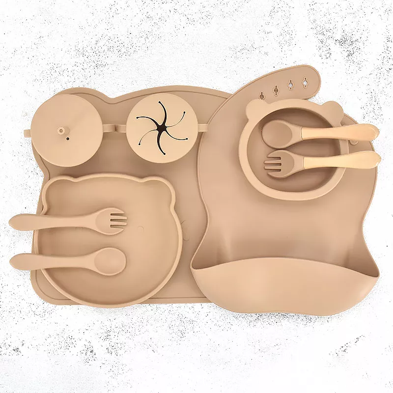• Complete set – includes plate, bowl, utensils, cup, snack container, bib, and dining mat.