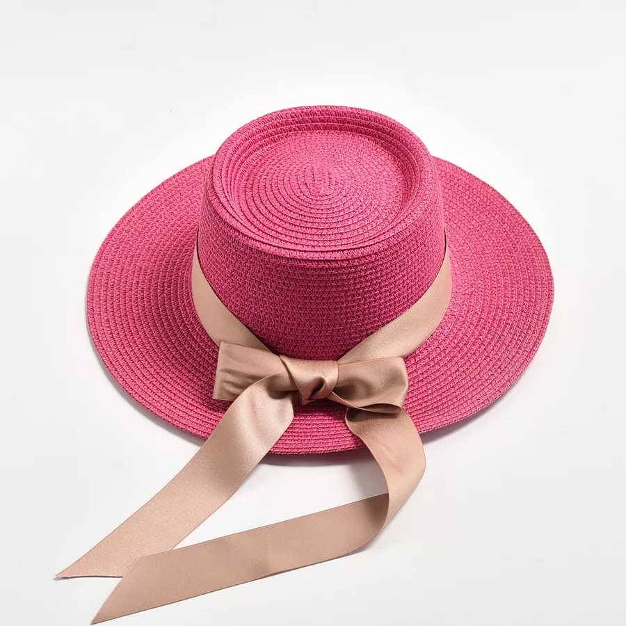 Elegant Flat Top Straw Sun Hat with Ribbon Bowknot for Women
