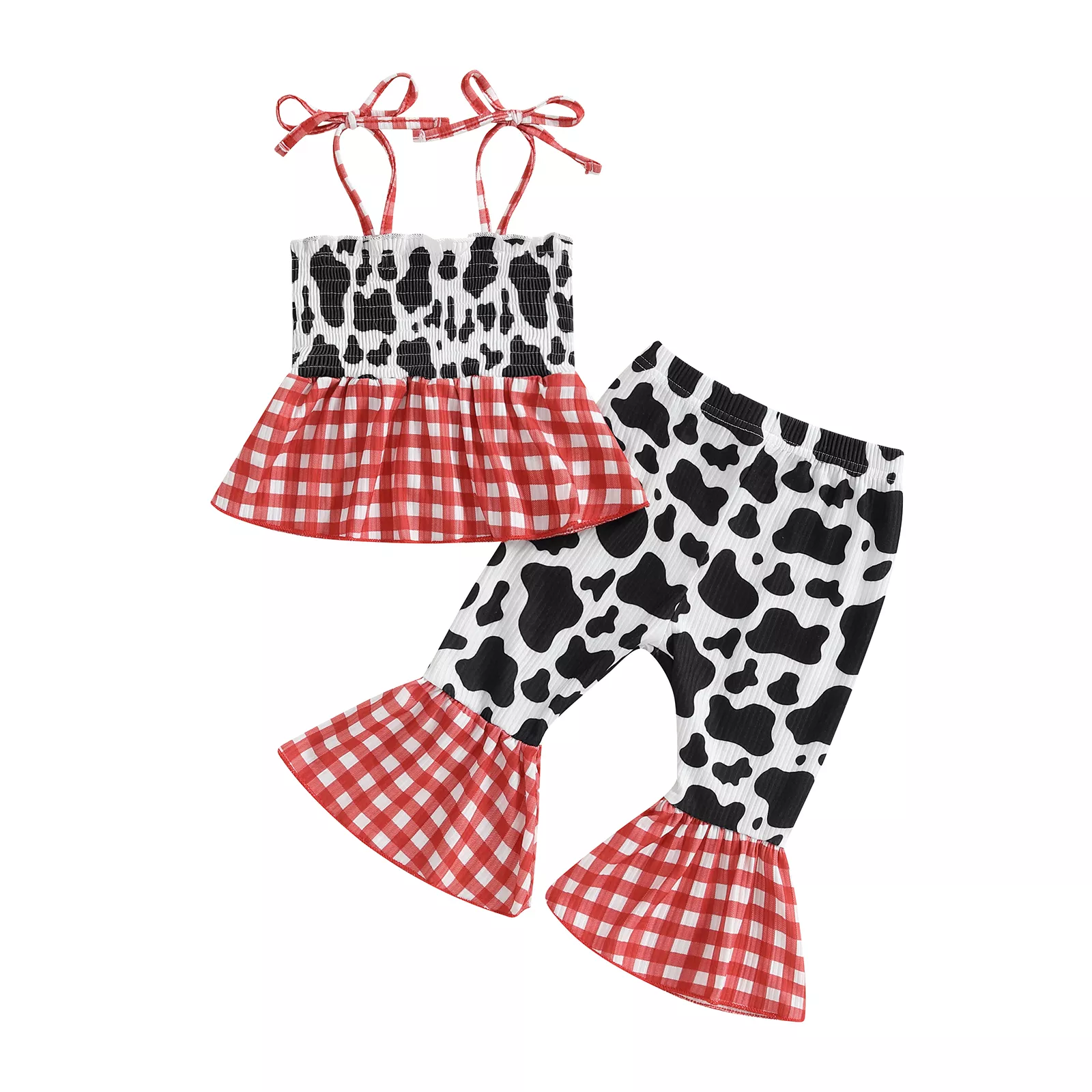 This adorable outfit includes a tie-up strap camisole with a square neckline and a sleeveless cut that keeps things cool and breathable. The matching flared pants have a soft elastic waistband to ensure a snug, flexible fit—no fussing, no pinching. The bold cow plaid print adds just the right amount of fun and flair, making this set a standout choice for little girls with big style.