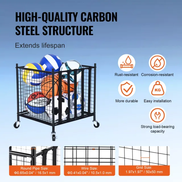 This sports ball storage cart is crafted from high-quality carbon steel, ensuring a strong and stable structure that can hold multiple sports balls without bending or warping. The painted surface enhances corrosion and rust resistance, making it ideal for both indoor and outdoor use. The vertical stacking design allows you to store more balls while saving space, keeping your garage, gym, or play area neat and clutter-free.