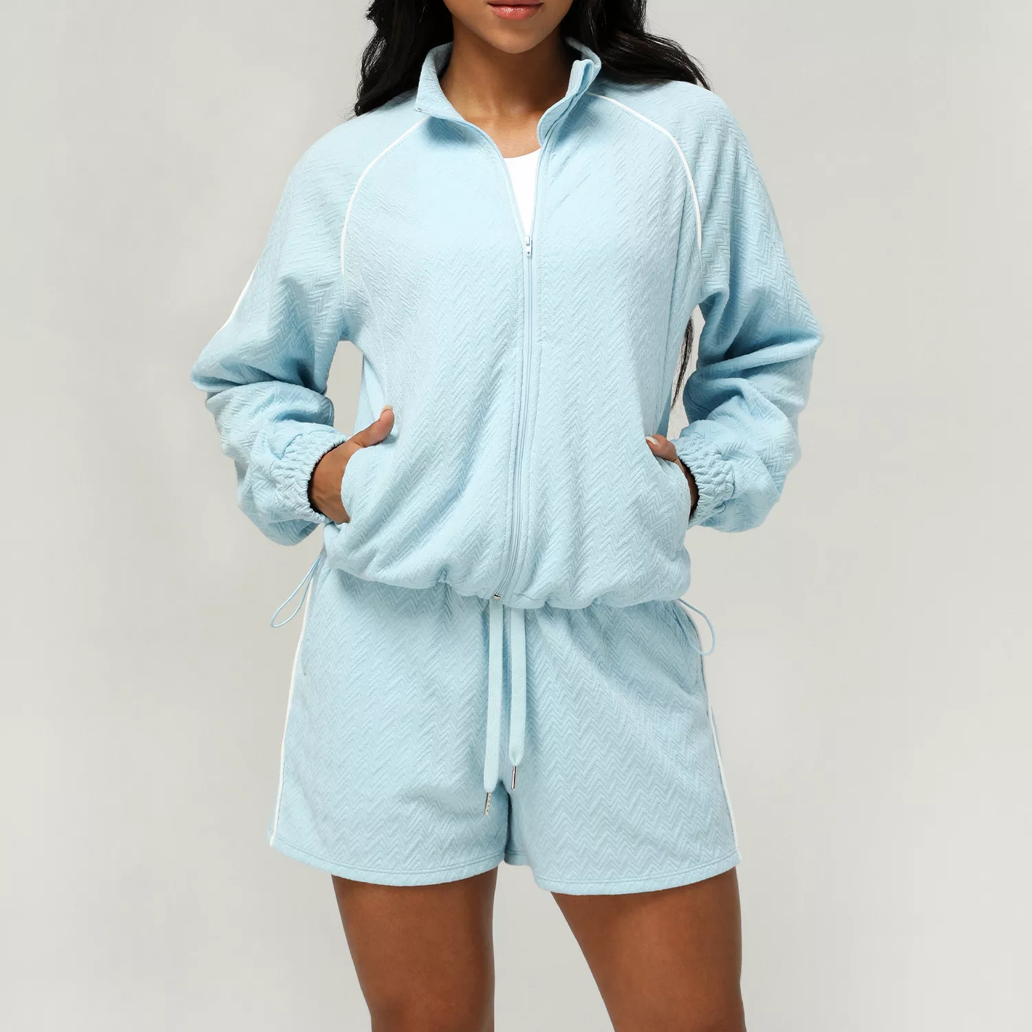 The jacket features full-length sleeves and a zip front for customizable coverage, while the fitted gym shorts stay perfectly in place and offer utility pockets for your essentials. The fit is true to size and hugs your body in all the right places—flattering, flexible, and fierce.