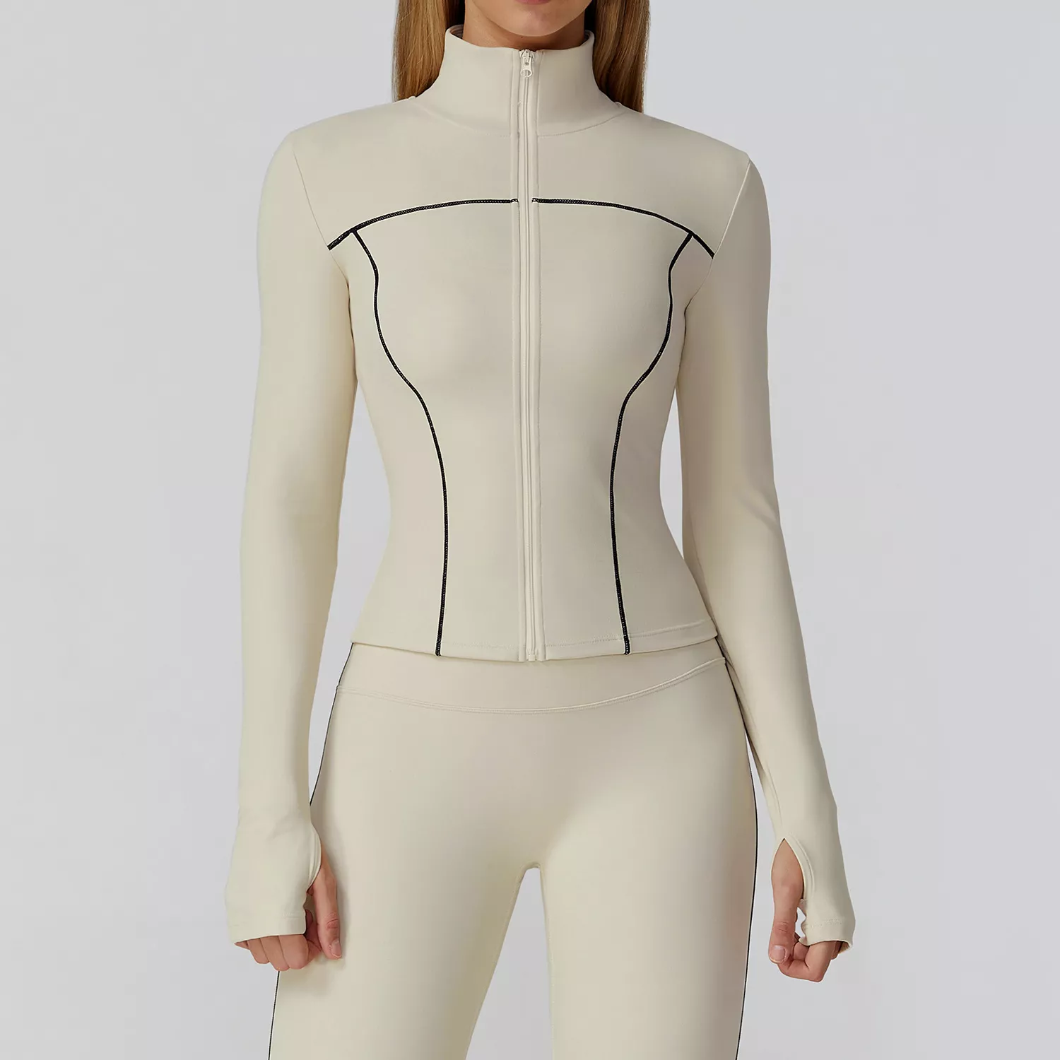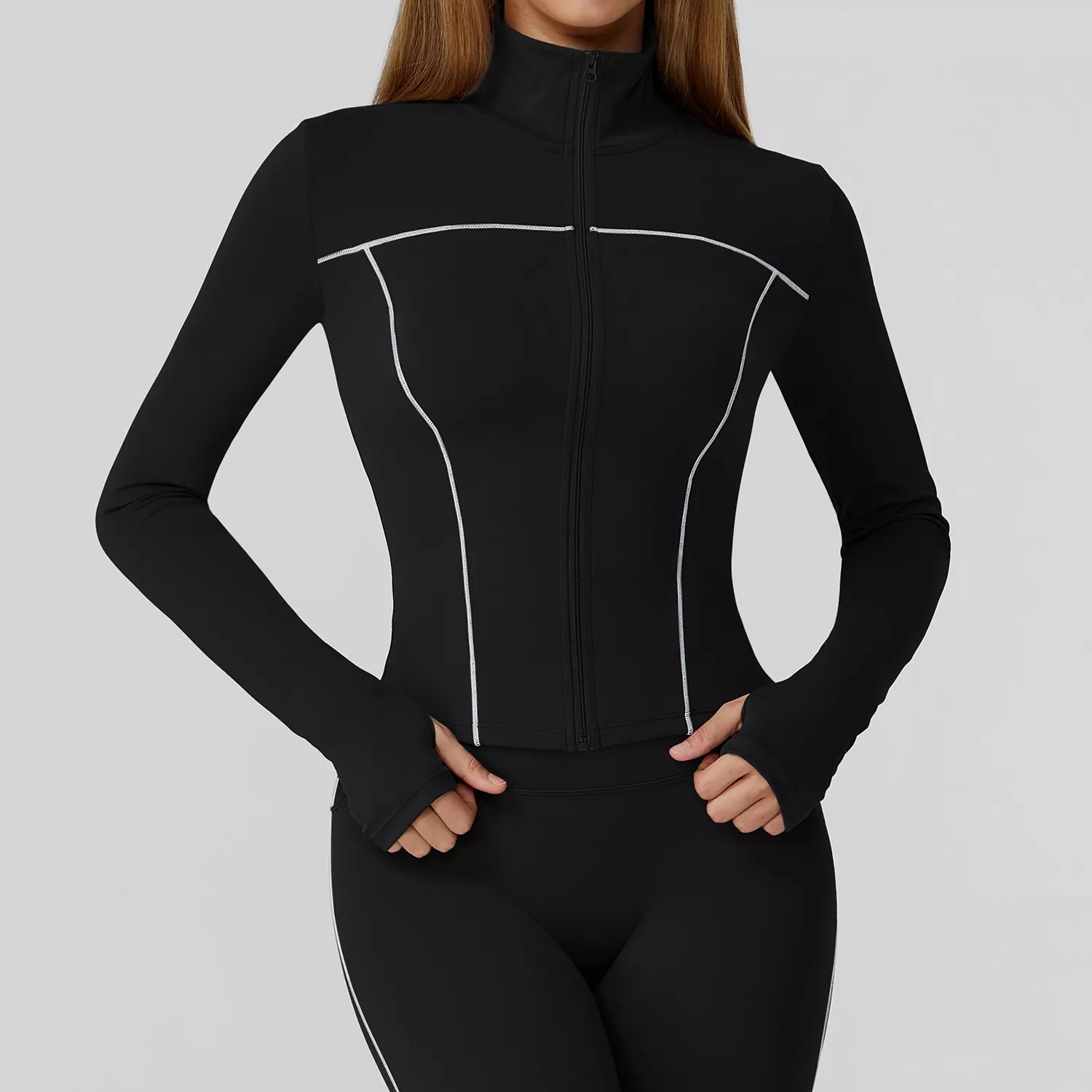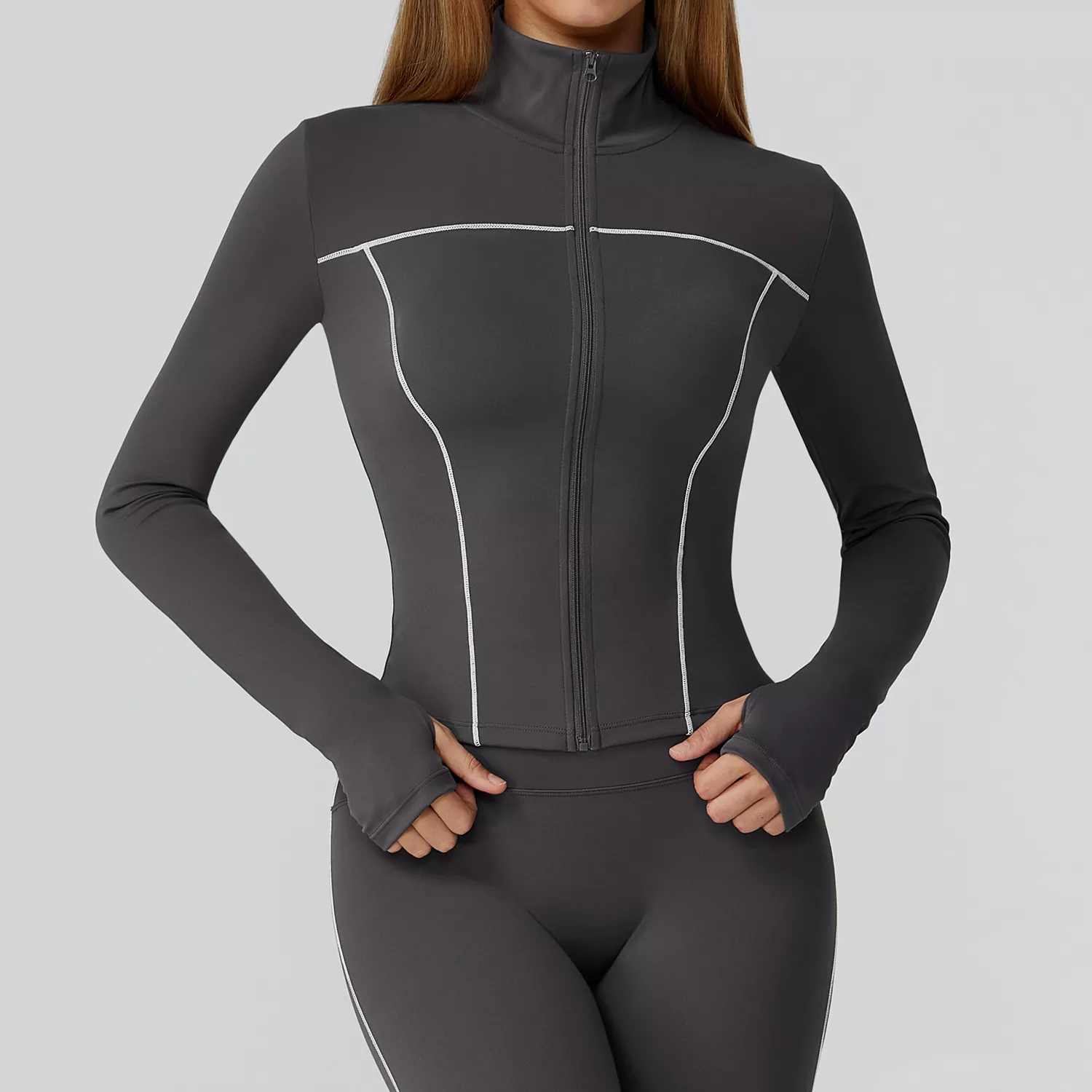 Elevate your workout wardrobe with this sleek and functional long sleeve yoga jacket. Designed with active women in mind, this zip-up top combines comfort, breathability, and style to help you perform at your best—whether you’re stretching on the mat, hitting the gym, or going for a morning run. Its flattering slim fit and modern cut ensure you not only feel good but look confident in every stride and stretch.